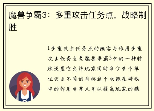 1. 多重攻击任务点的概念与作用 多重攻击任务点是魔兽争霸3中的一种特殊设置,它允许玩家同时命令多个单位攻击不同的目标。这个功能在游戏中的作用非常大,可以提高玩家的操作效率和战斗策略。我们将详细介绍如...