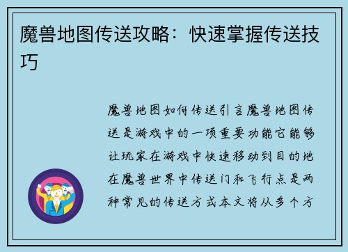 魔兽地图如何传送 引言: 魔兽地图传送是游戏中的一项重要功能,它能够让玩家在游戏中快速移动到目的地。在魔兽世界中,传送门和飞行点是两种常见的传送方式。本文将从多个方面详细阐述魔兽地图的传送功能,包括传...