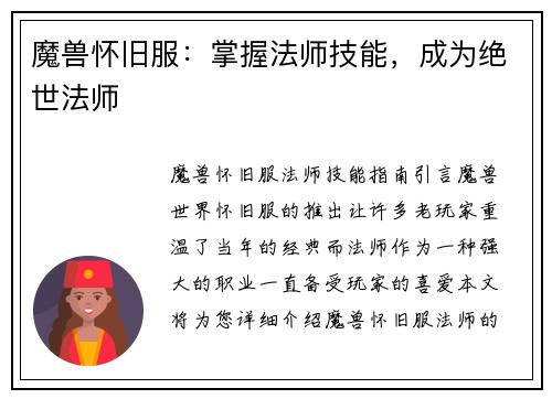 魔兽怀旧服法师技能指南 引言: 魔兽世界怀旧服的推出让许多老玩家重温了当年的经典,而法师作为一种强大的职业,一直备受玩家的喜爱。本文将为您详细介绍魔兽怀旧服法师的技能,帮助您更好地掌握这个职业的特点和...
