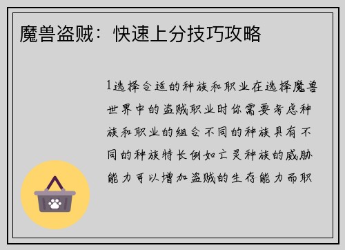 1.选择合适的种族和职业 在选择魔兽世界中的盗贼职业时,你需要考虑种族和职业的组合。不同的种族具有不同的种族特长,例如亡灵种族的"威胁"能力可以增加盗贼的生存能力。而职业特长也非常重要,例如精通暗影或...