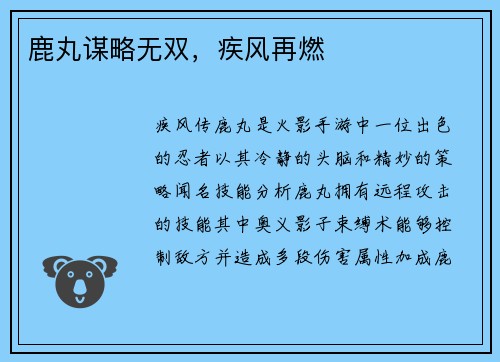 疾风传鹿丸是火影手游中一位出色的忍者,以其冷静的头脑和精妙的策略闻名。 技能分析 鹿丸拥有远程攻击的技能,其中奥义「影子束缚术」能够控制敌方,并造成多段伤害。 属性加成 鹿丸的属性加成主要集中在智力、...